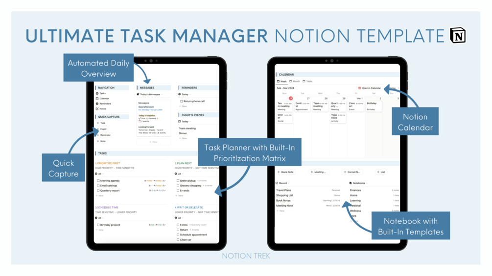 πŸš€ Boost your productivity and decrease your mental load with the Ultimate Task Manager Notion template by Notion Trek, your digital personal assistant!